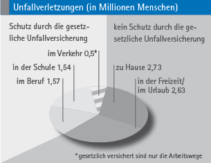 Eine Million Menschen werden so schwer verletzt, dass sie im Krankenhaus behandelt werden müssen. Etwa 21 % der Unfälle ereignen sich bei der Arbeit, rund 30 % im Haus, 23 % der Unfälle passieren beim Spielen und Sporttreiben, 18 % im Verkehr, 7 % der Unfälle werden als „sonstige Unfälle“ bezeichnet. Nach unterschiedlichen Schätzungen waren 30 bis 50 % aller Unfälle durch gezielte und wirksame Vorkehrungen zu verhindern. |